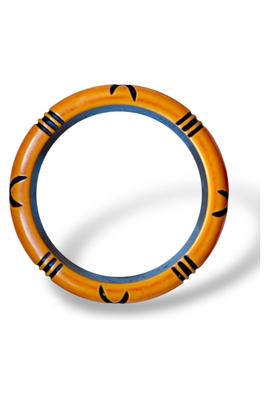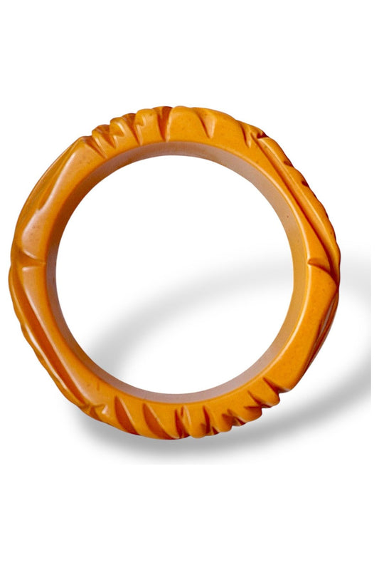 Vintage Butterscotch Bakelite Bangle with Deep Carved Deco Motif – 1930s/40s Era