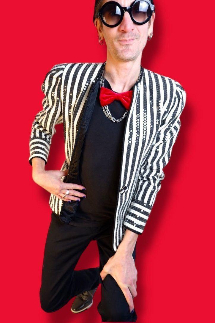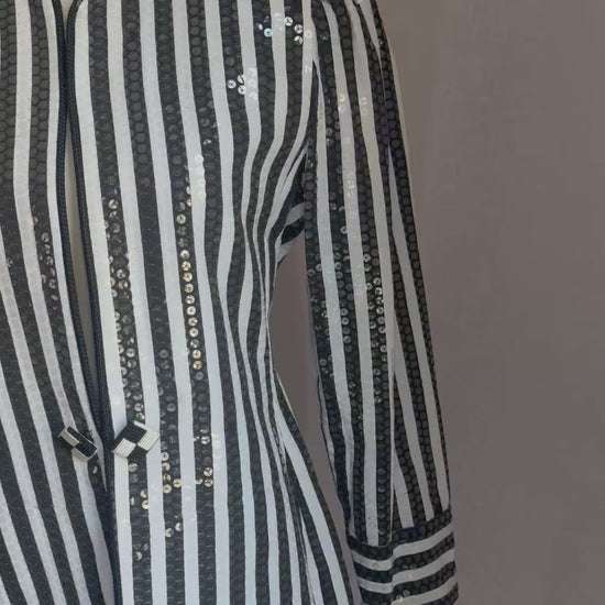She arrived at the soirée like a vision from a dream—sharp, sophisticated, and dripping in vintage glamour. The monochrome stripes shimmered under the dim lighting, each sequin catching a whisper of brilliance. A knowing smile played on her lips as she draped the jacket over her shoulders, the perfect balance of edgy sophistication and timeless elegance.