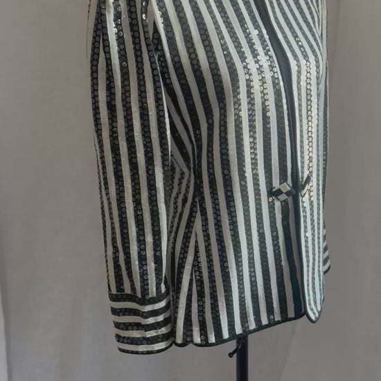 This 1980s Karen Lawrence striped sequin jacket is a dazzling statement piece that commands attention. The black and white stripes, enhanced with sequins, create a striking visual contrast. A structured silhouette with subtle shoulder padding adds drama, while the elegant open-front design makes it effortlessly chic. Perfect for cocktail parties, evening events, or as a high-fashion layering piece.