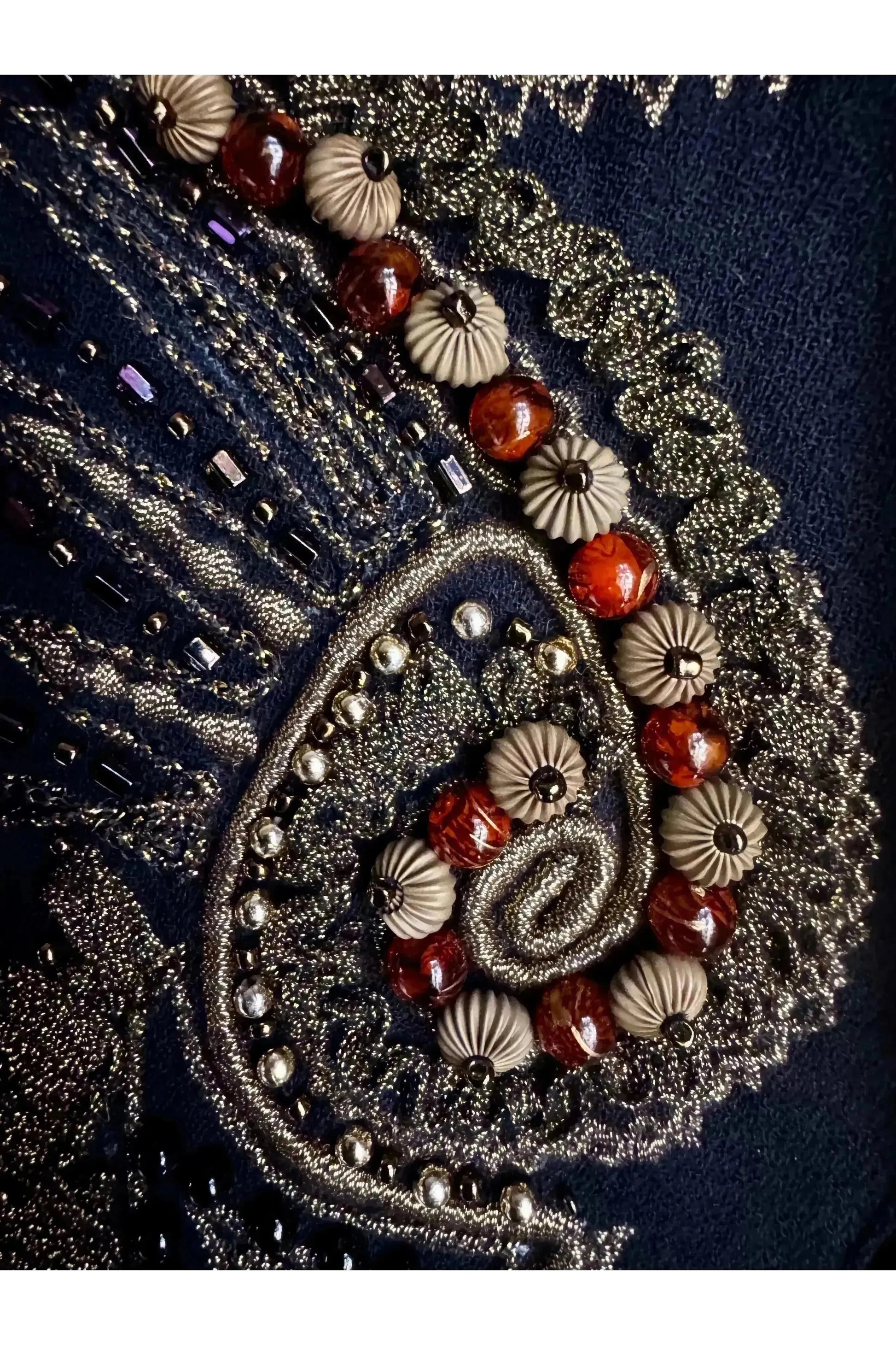 She walked into the grand hall, the whispers of elegance trailing behind her. This Orlando Rossi jacket and dress set in deep black wool was her armor—sophisticated, bold, and adorned with exquisite golden embroidery that caught the light. The intricate beading danced across her shoulders, adding a hint of opulence to her poised silhouette. She felt unstoppable, wrapped in a piece that was as much art as it was attire.