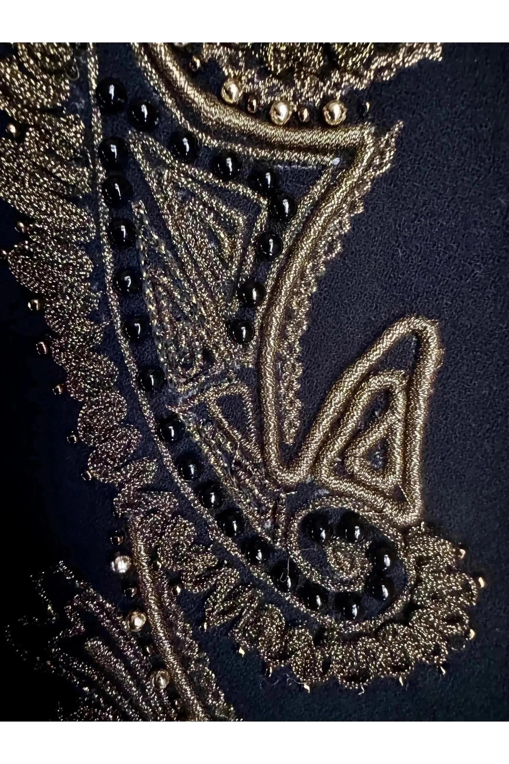 - Jacket: Cropped length with intricate gold embroidery and beaded detailing