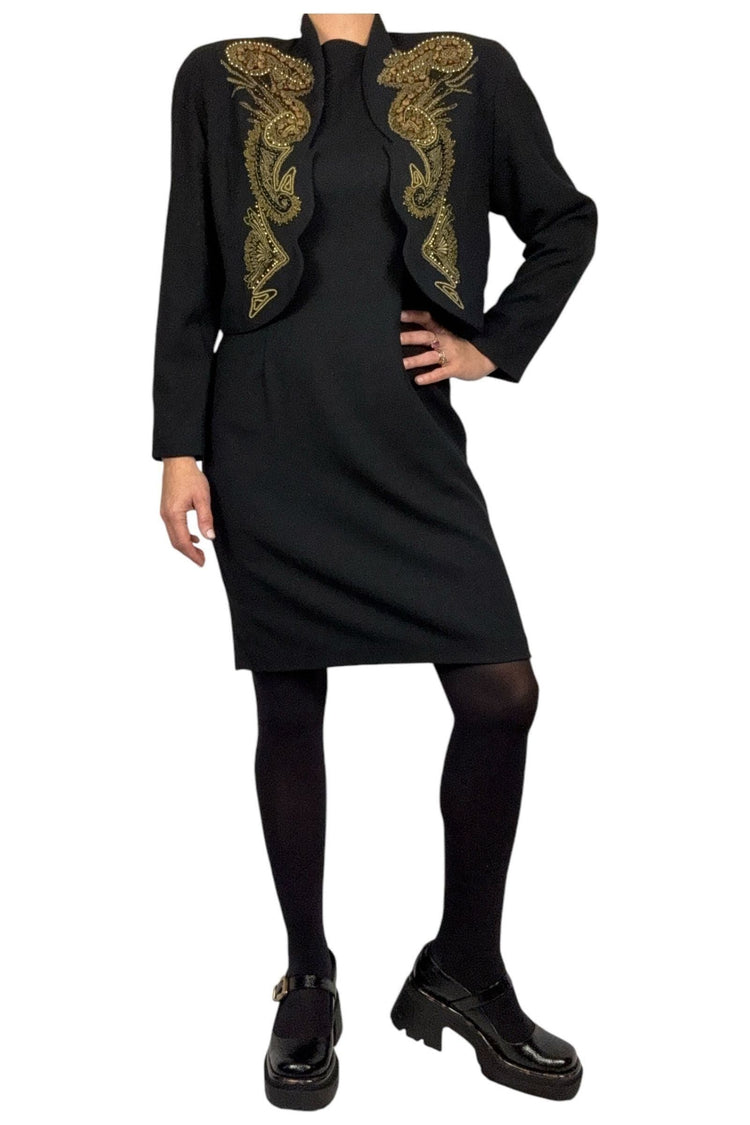 This vintage Orlando Rossi two-piece set, crafted from 100% wool, exudes a timeless elegance with its tailored black dress and embellished cropped jacket. The jacket features ornate gold embroidery and beadwork, creating a striking contrast against the dark wool. Whether worn together as an ensemble or styled separately for added versatility, each piece carries an air of sophistication. Perfect for formal events or occasions that call for a touch of classic glamour, this set embodies a vintage charm that makes a statement.